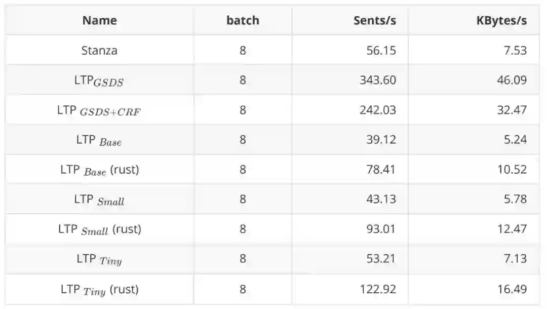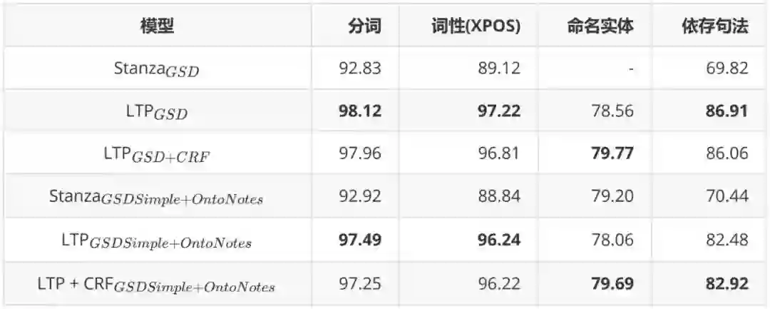 表1 LTP 和 Stanza 在 LTP 数据集上的结果。