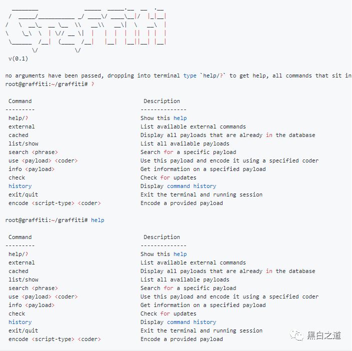 Graffiti本身内置终端工具,可直接通过拖拽源文件实现编码,无需手动传递参数。工具支持查看历史记录,并能够运行外部命令,以及其本身自带的内部命令。输入“help”或“?”即可查看工具的帮助信息: