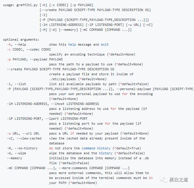 当您需要快速编码的有效负载时,Graffiti还附带命令行参数: