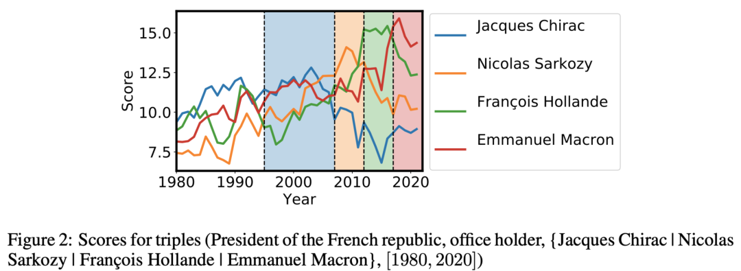 上图中,你可以看到这个模型如何对描述法国总统的事实的可能性进行评分:自2017年以来,伊曼纽尔·马克龙的得分更高,而弗朗索瓦·奥朗德在2012–2017年的得分更高。
