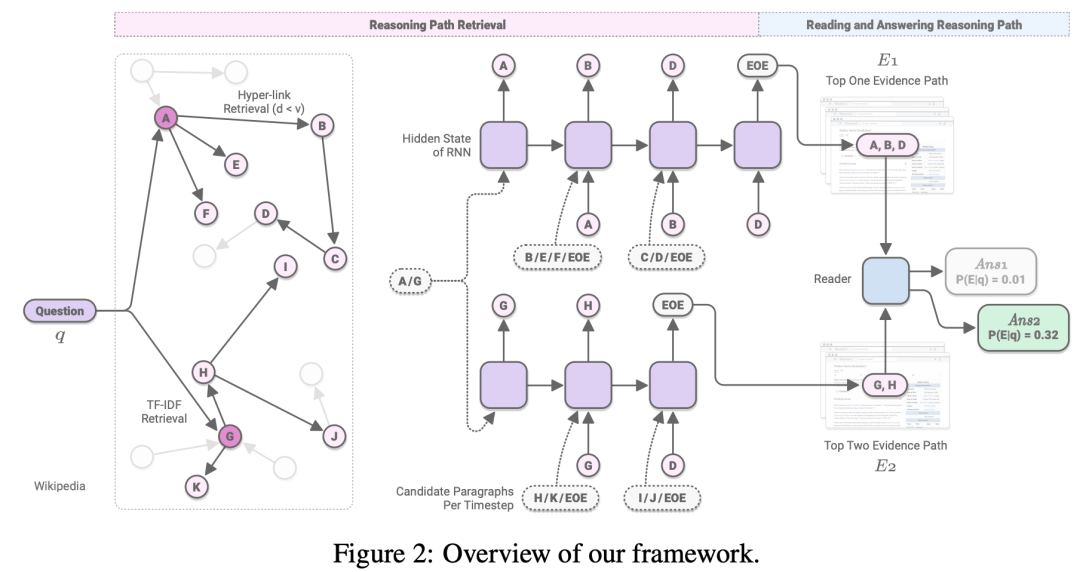 Asai等人的工作专注于HotpotQA,他们提出了Recurrent Retriever的结构,这是一种开放域QA的体系结构,能够以可区分的方式学习检索推理路径(段落链)。