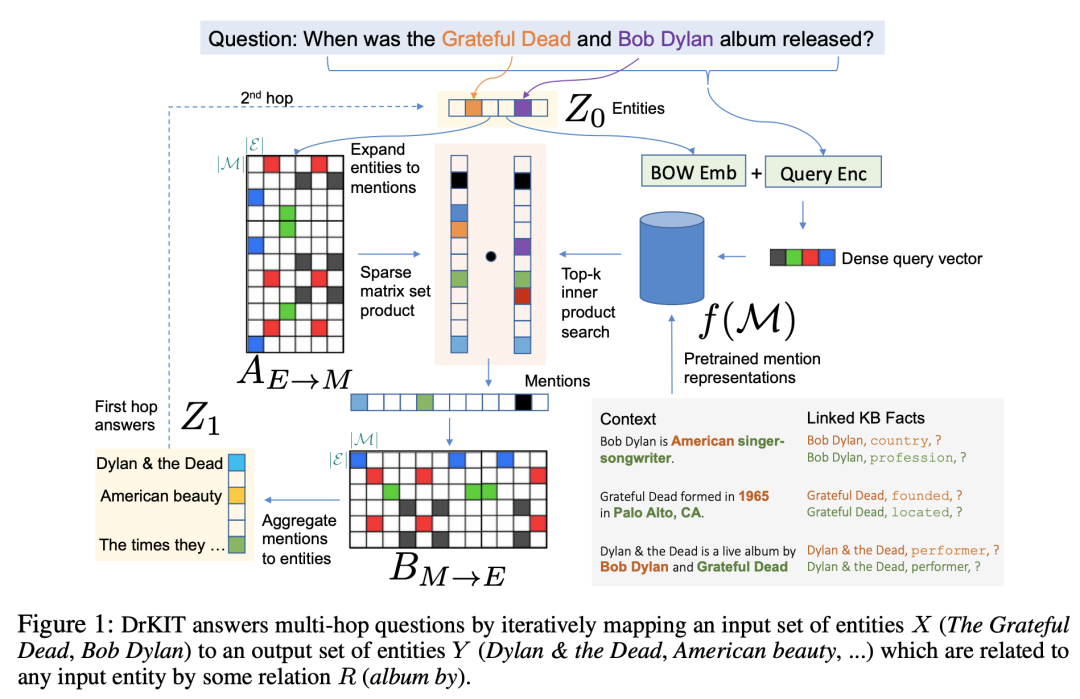 Dhingra等人的工作在概念矿建上与上面Cohen等人的工作类似。他们提出了DrKIT,这是一种能用于在索引文本知识库上进行差分推理的方法。