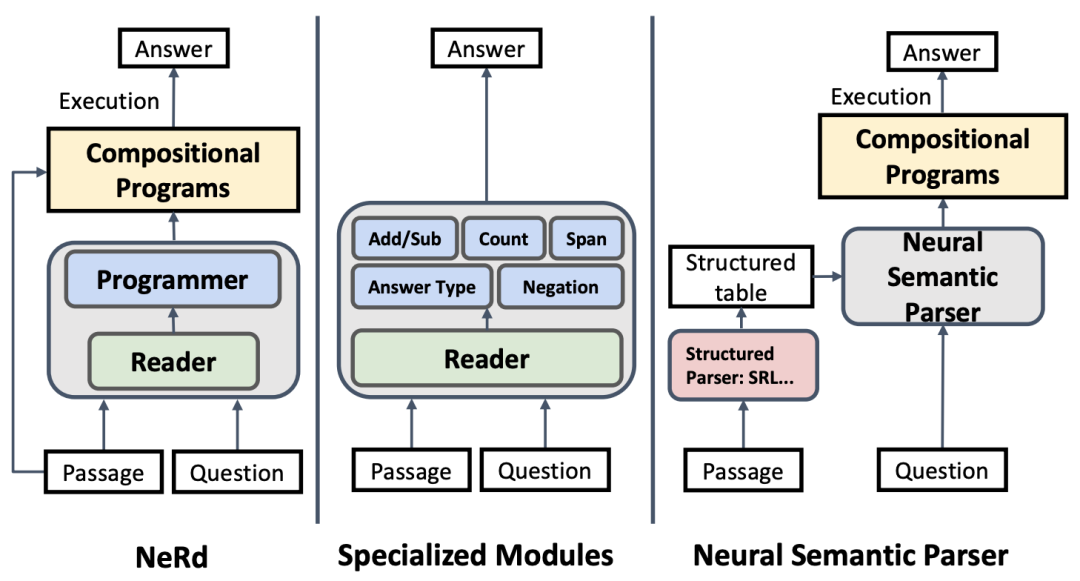 在ICLR 2020 上,有两篇这方面的工作。一篇是是Chen 等人的工作,提出了一个神经符号读取器NeRd(Neural Symbolic Reader);另一篇是Gupta等人在神经模块网络NMN(Neural Module Networks)上的工作。