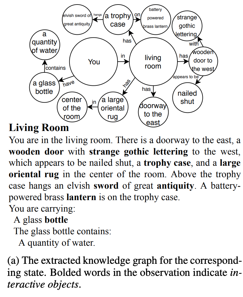 例如,词汇表中有数十个模板和数百个单词。尝试所有可能的排列是不可行的。但当你维护一个可见实体的知识图谱时,agent的可选项就会大幅度减少,于是便可以更快地推进游戏。