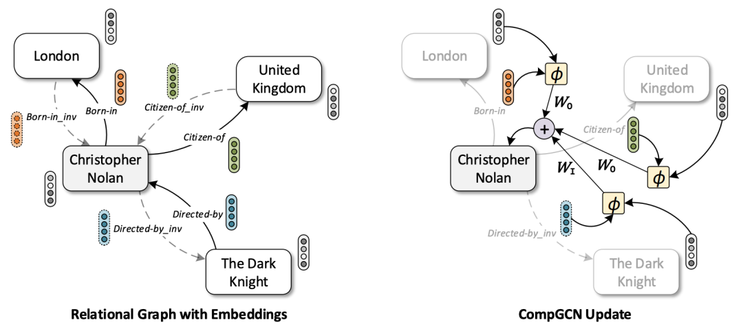 Vashishth 等人提出的 CompGCN体系结构为你带来了所有这些优点。标准的图卷积网络以及消息传递框架在考虑图时,通常认为边是没有类型的,并且通常不会构建边的嵌入。