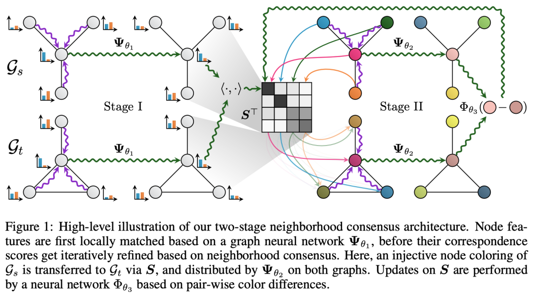 Fey 等人推出了DGMC框架(深度图匹配共识,Deep Graph Matching Consensus),这个框架包括两大阶段: