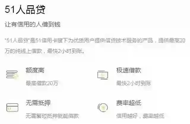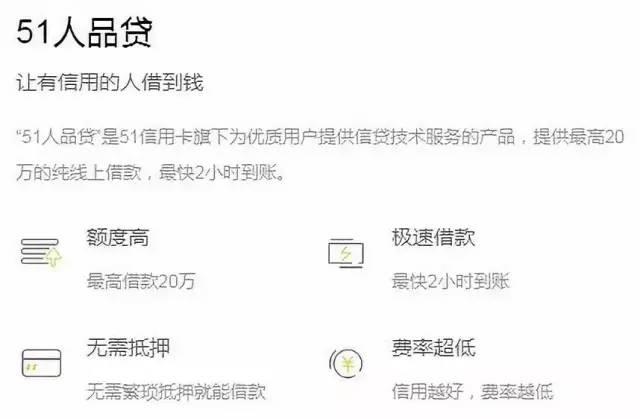 公开信息显示,“51人品贷”为51信用卡一款面向信用卡持卡人的放贷产品,定位于解决个人短期资金紧张问题,最高可借20万,最快2小时到账。