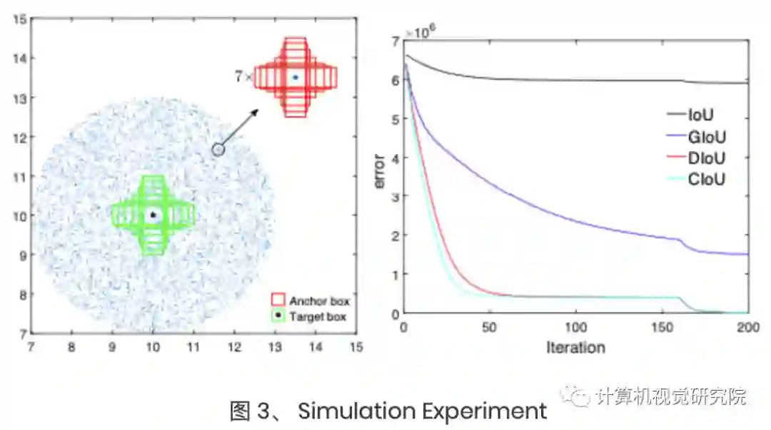 论文将5000个中心点上的bbox在最后阶段的total error进行了可视化。IoU loss只对与target box有交集的bbox有效,因为无交集的bbox的为0。而GIoU由于增加了惩罚函数,盆地区域明显增大,但是垂直和水平的区域依然保持着高错误率,这是由于GIoU的惩罚项经常很小甚至为0,导致训练需要更多的迭代来收敛。
