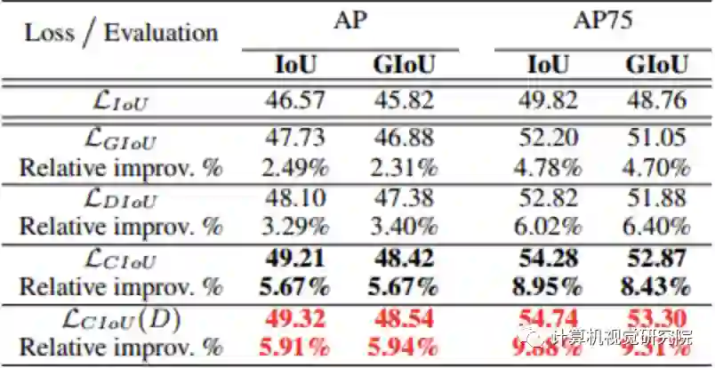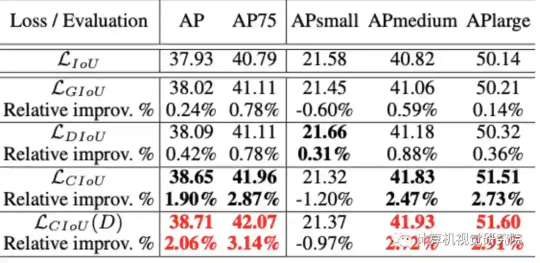 在Faster R-CNN ResNet-50-FPN上,由于Faster R-CNN本身提供的bbox质量都比较高,因此,GIoU的优化都很小,但此时DIoU和CIoU则表现了不错的优化效果。注意到,CIoU在小物体上的性能都有所下降,可能由于长宽比对小物体的检测贡献不大,因为此时中心点距离比aspect ratio更重要。