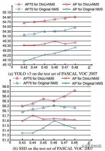 最后作者进行了比较实验,原NMS和DIoU-NMS分别移植到了yolov3和ssd模型,同时使用CIou loss。在阈值的范围内比较了原始NMS和DIoU-NMS [0.43,0.48]。从图9中可以看出,对于每个阈值,DIoU-NMS都优于原始NMS。此外,值得注意的是,即使是最糟糕的DIoU-NMS也是要优于最优的原始NMS。