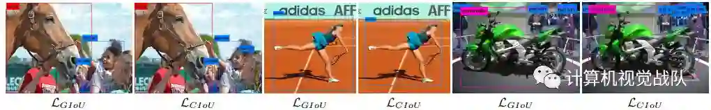 上图对GIoU和CIoU的结果进行了可视化,可以看到,在中大型物体检测上,CIoU的结果比GIoU要准确。