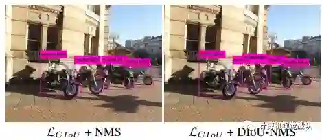 在原始的NMS中,IoU指标用于抑制多余的检测框,但由于仅考虑了重叠区域,经常会造成错误的抑制,特别是在bbox包含的情况下。因此,可以使用DIoU作为NMS的标准,不仅考虑重叠区域,还考虑了中心点距离。(基于DIoU作为NMS标准,虽然多了距离这个维度去考虑问题,但和NMS面对的同样的情况是当两个不同的目标本身就靠的很近的时候还是会造成错误的抑制)
