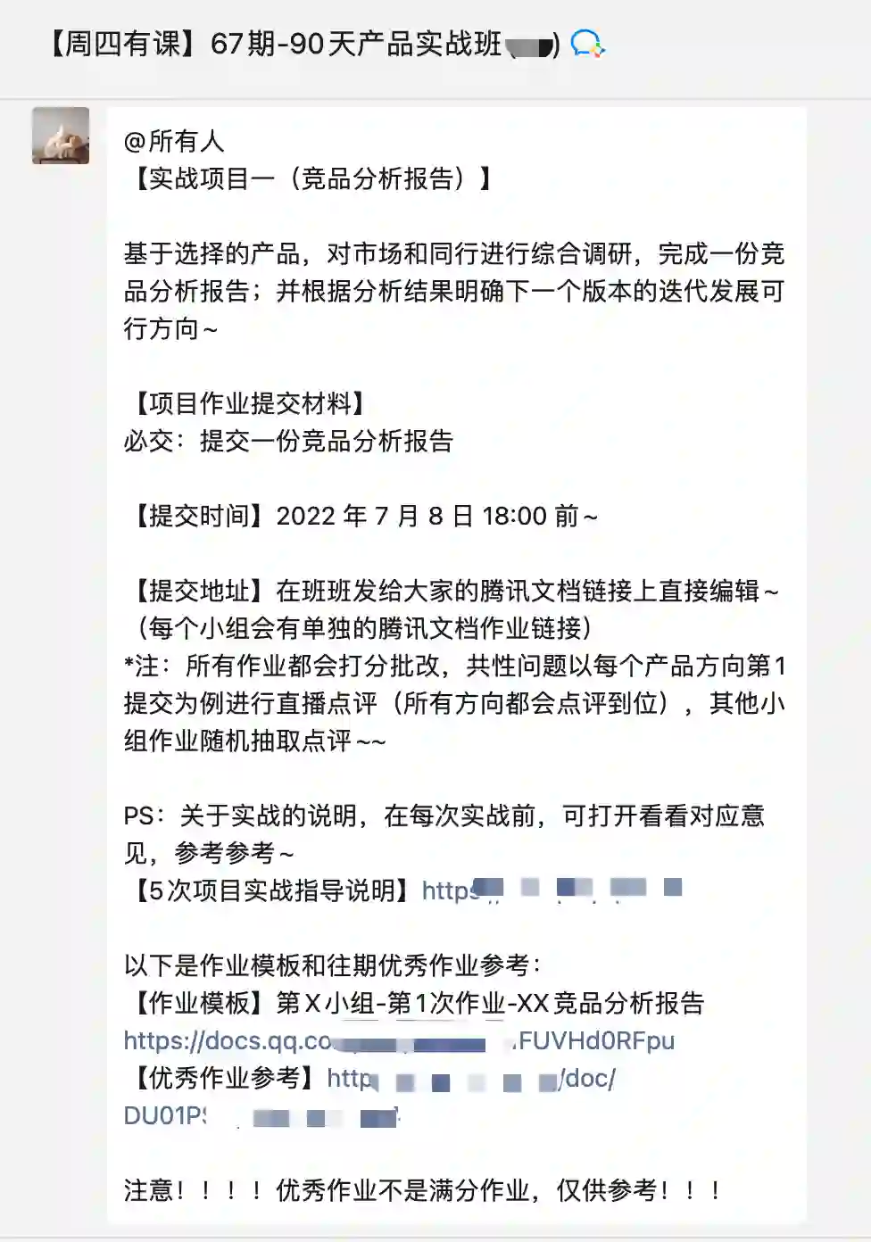 因此在课程中,《90天产品经理实战班》将围绕所学的不同模块,组织同学们进行5次实战,充分吸收所学知识,产出物非常明确。