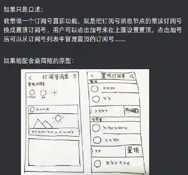 哪怕这个原型图是一个手绘的、很简陋的原型,也比一大段文字来的容易理解。