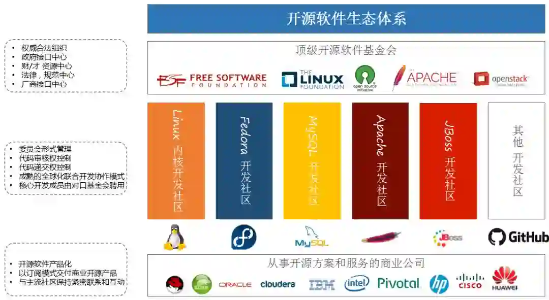 如果你把整个开源软件生态体系看成一家公司的话,基本可以这样概括: