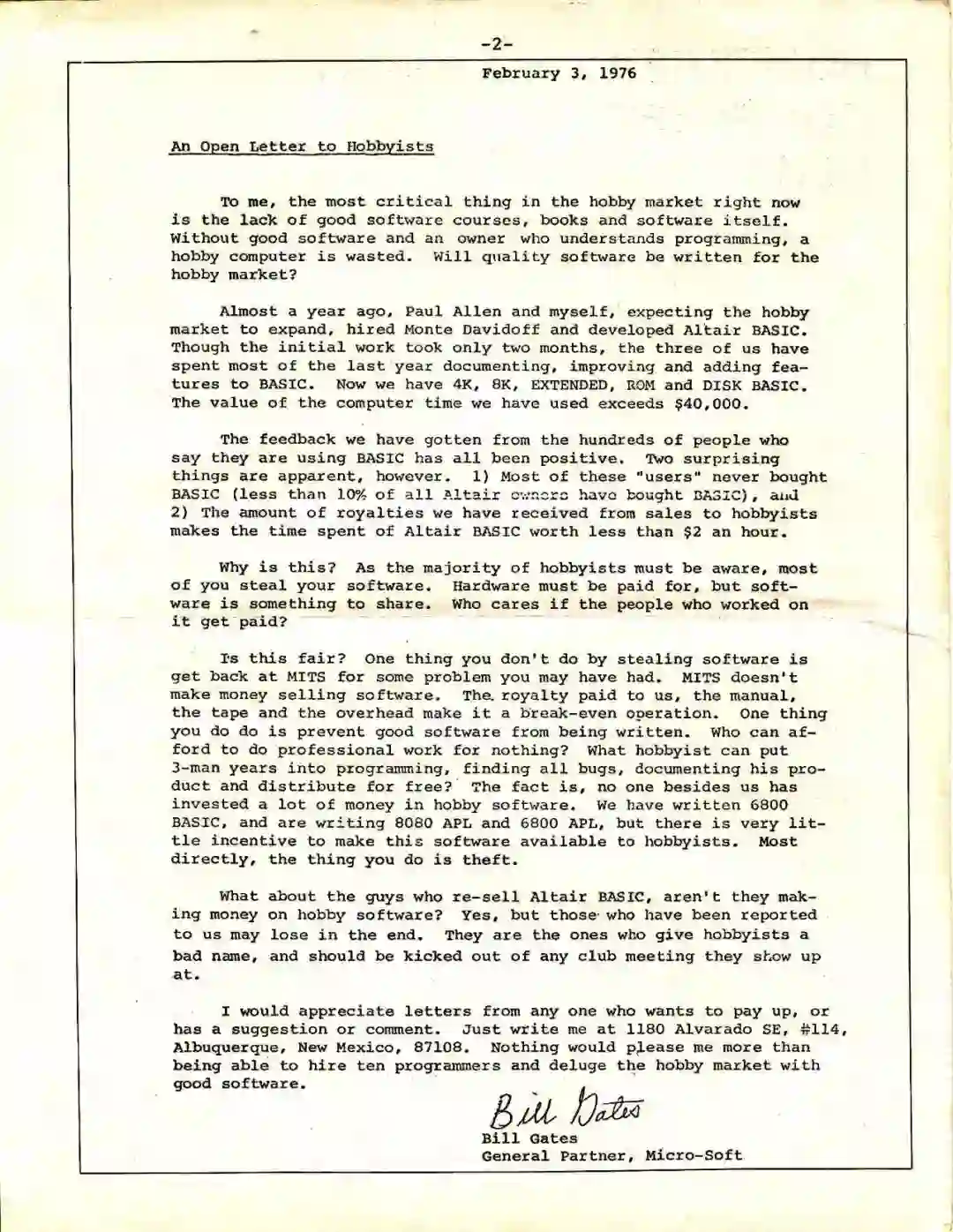 直到1976年2月3日,比尔·盖茨给电脑爱好者们写了一封公开信,抱怨未经授权使用Altair BASIC的情况太普遍,导致新成立的微软公司回报甚微。这封信相当有名,被看作是软件通过商业授权获取收入的真正开端。