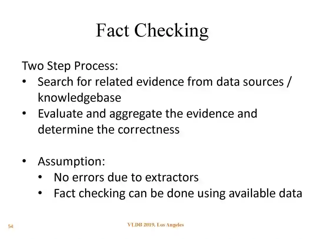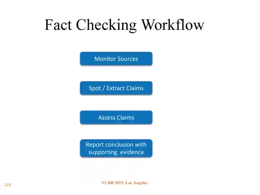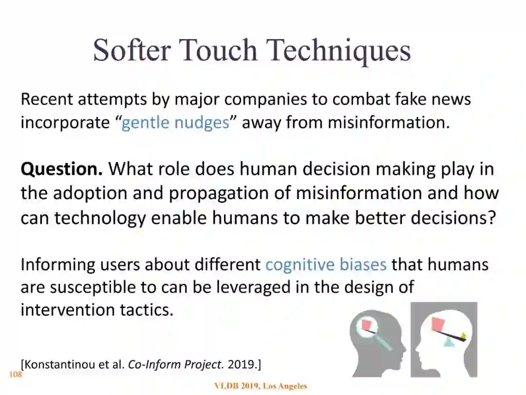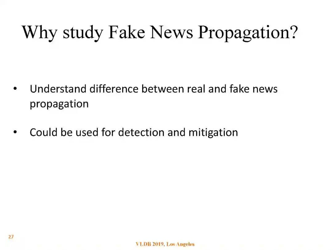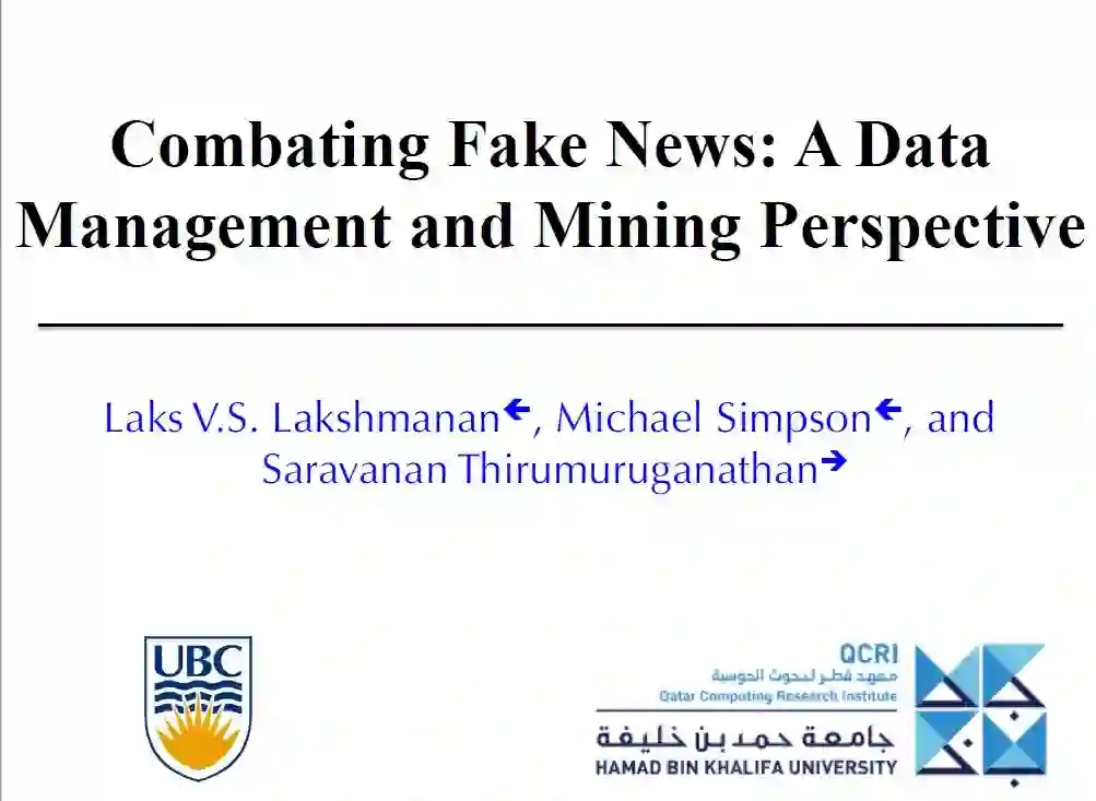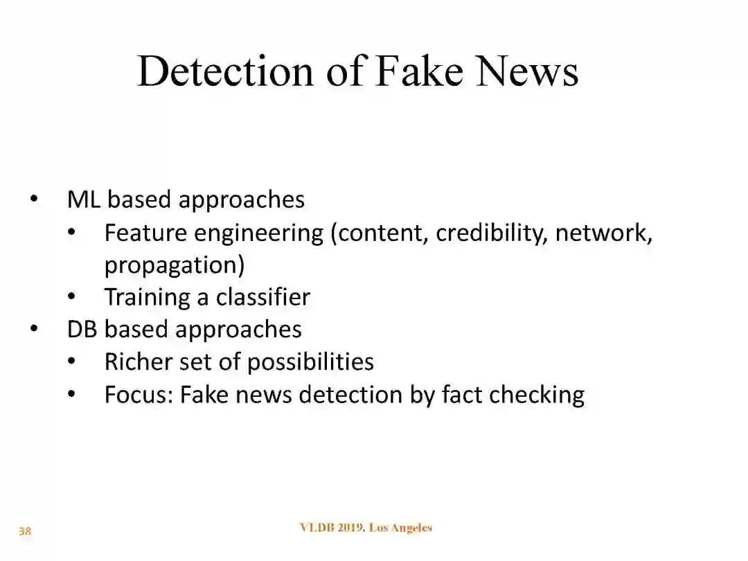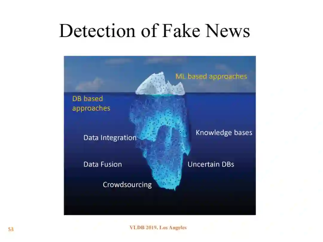 【导读】VLDB 2019(Very Large Data Bases)是三大国际顶尖数据库会议之一(其余二者为SIGMOD和ICDE),根据大会官方公布,今年VLDB共接收了128篇Research Paper、22篇IndustryPaper和48个Demo。VLDB 2019已经于2019.8.26-2019.8.30在洛杉矶召开。专知推荐在VLDB 2019上的一个虚假新闻(Fake News)检测的全面综述教程,本教程是数据库和社交网络领域的三位资深教授讲授,提供了最新关于Fake News相关技术的全景视图,包括检测,传播,缓解和假新闻的干预,教程涵盖了数据集成、真相发现与融合、概率数据库、知识图和假新闻视角下的众包等领域的研究,也是一个新兴研究方向。
