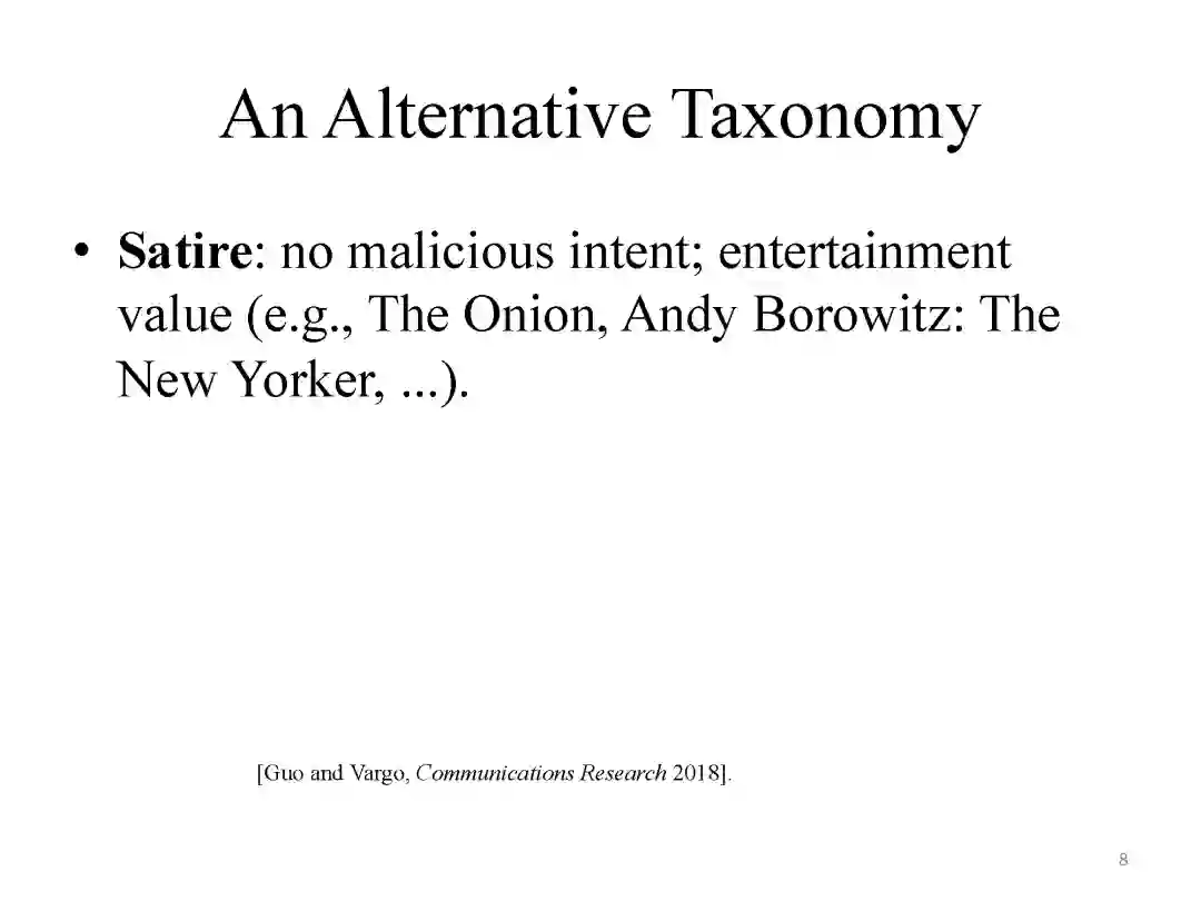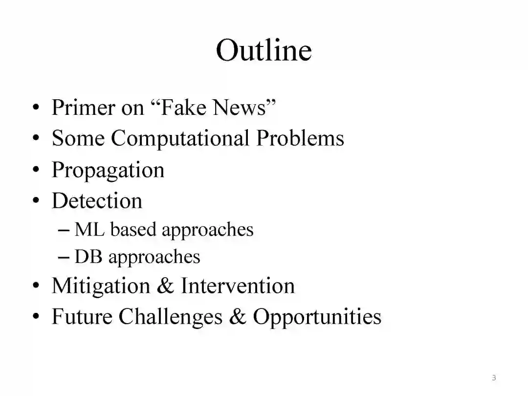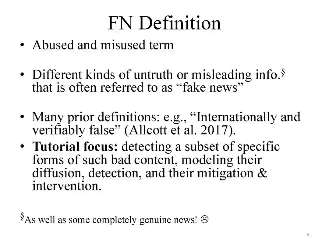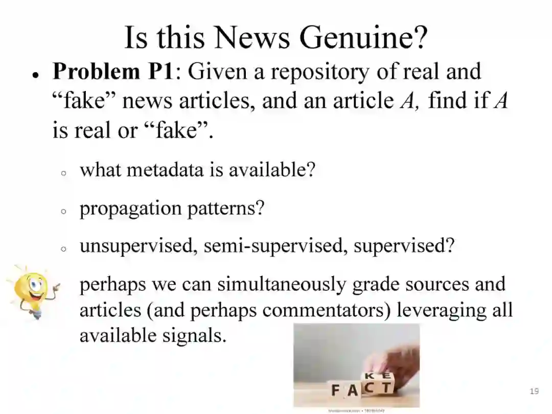 虚假新闻(Fake News)是对全球民主的一大威胁,导致人们对政府、新闻和社会的信任度下降。社交媒体和社交网络的大众普及,导致了假新闻的蔓延,阴谋论、虚假信息和极端观点在这些地方盛行。假新闻的发现与治理是当今时代的基本问题之一,受到了广泛的关注。尽管snopes、politifact等事实核查网站,以及谷歌、Facebook和Twitter等大公司,已经采取了初步措施来处理假新闻,但还有很多工作要做。作为一个跨学科的话题,从机器学习、数据库、新闻、政治学到其他很多领域,人们都在研究假新闻的各个方面。
