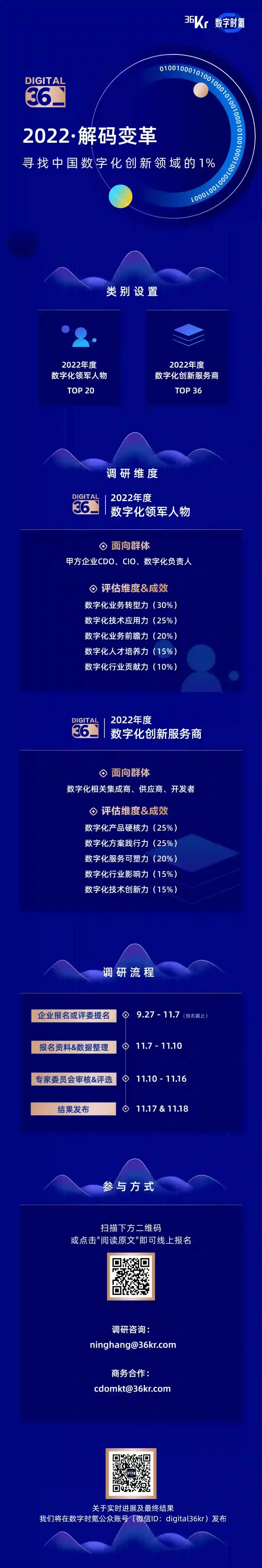 我们希望站在时代创新的高山上,与所有人共同瞭望中国数字化变革的现实与意义。这次调研,不会是一次单纯基于企业规模和商业化数字的追问。我们更希望借此机会,为全行业梳理出2022年真正值得被记住的「数字化领军人物」和「数字化创新服务商」。
