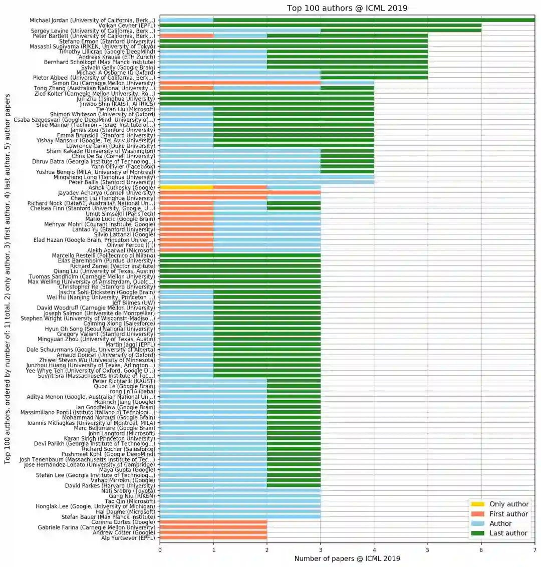 此外,ICML 2019 论文贡献最多的作者当属加州大学伯克利分校的机器学习大牛学习 Michael Jordan,被接收论文有 7 篇。其次是 EPFL(洛桑联邦理工学院)教授 Sergey Levin、加州大学伯克利分校的 Volkan Cevher 和 Peter Barlett。不得不说,加州大学伯克利分校真是人才辈出。
