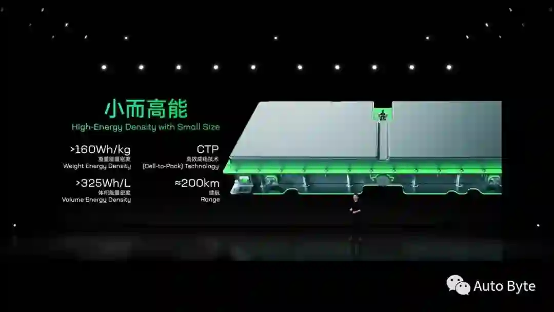 O的单个巧克力换电块大约可以提供200km左右的里程,采用了宁德时代最新CTP技术,重量能量密度超过160Wh/kg,体积能量密度超过325Wh/L。