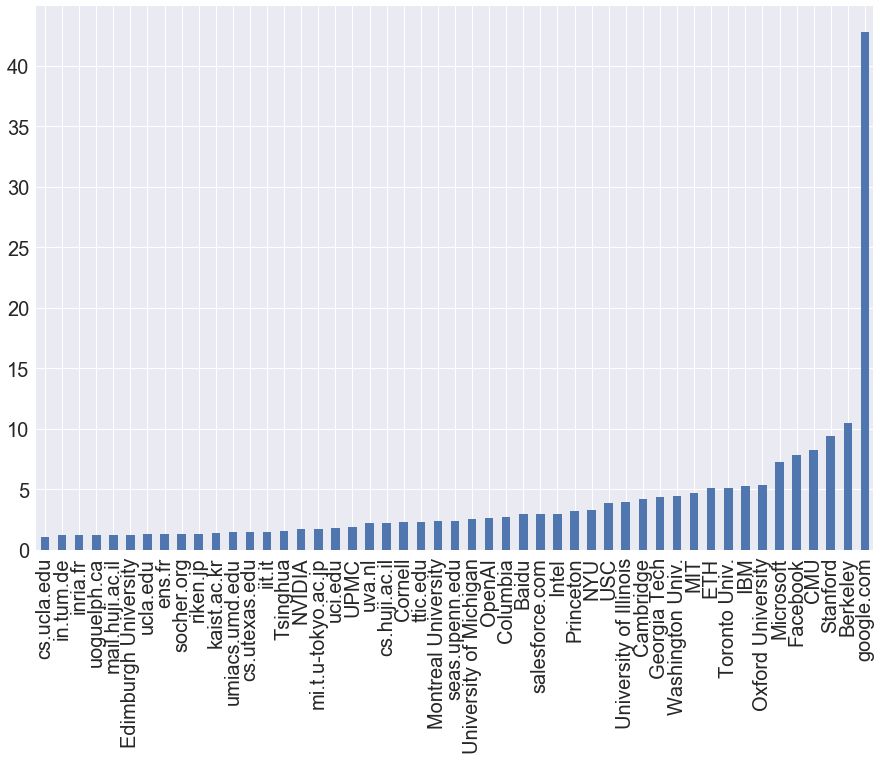 谷歌以3.33篇oral、42.78篇poster和0.56的接收率称霸榜首;伯克利名列第二,oral为2.56篇、poster为10.48篇,接收率为0.46;斯坦福排名第三,oral为1篇,poster为9.4篇,接收率为0.36。