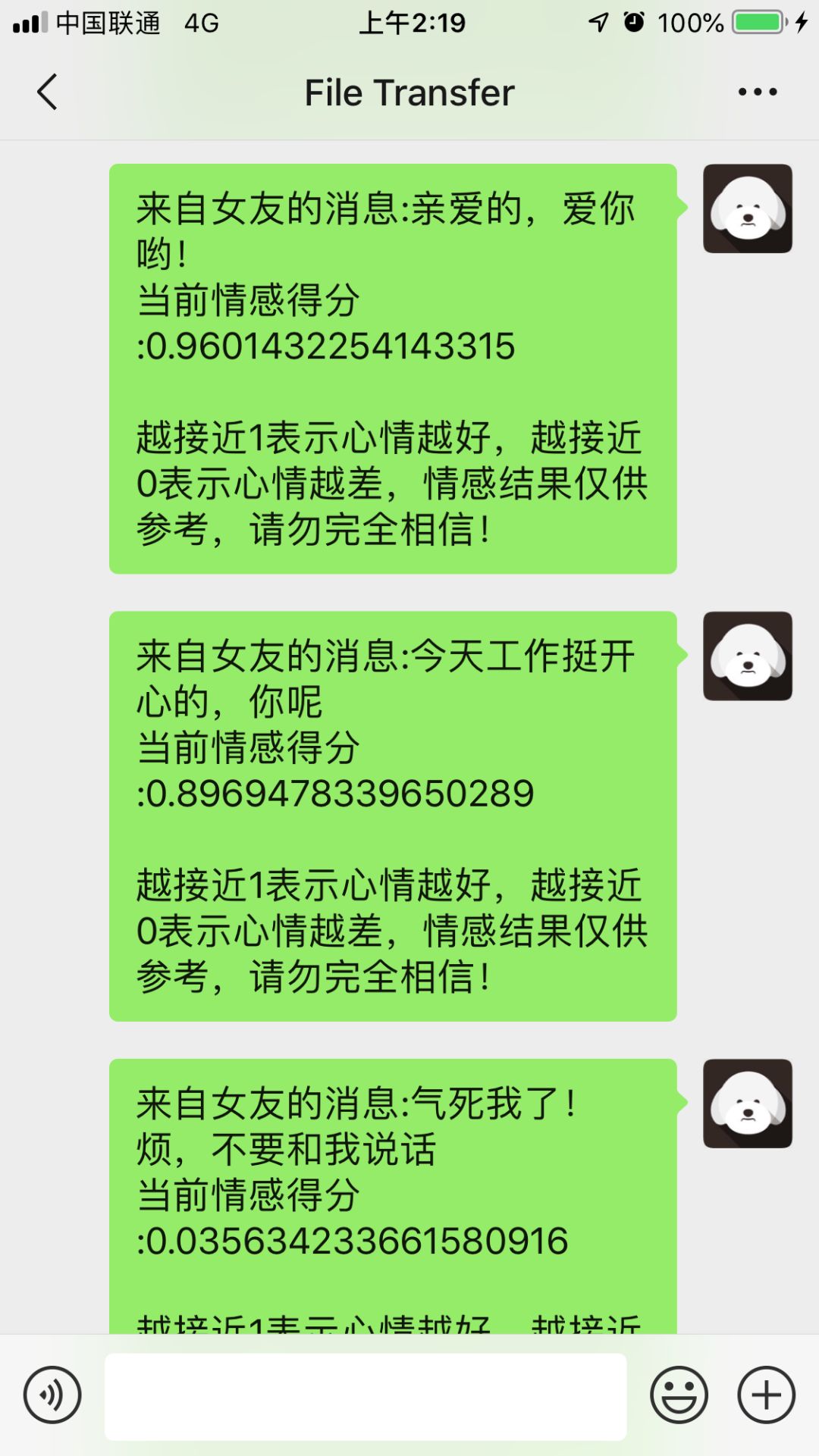 mood_message = u"来自女友的消息:" + msg.text + "\n当前情感得分:" + now_mod_rank + "\n越接近1表示心情越好,越接近0表示心情越差,情感结果仅供参考,请勿完全相信!\n\n"