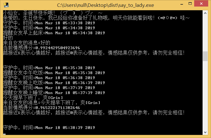 print("来自女友的消息:%s\n当前情感得分:%s\n越接近1表示心情越好,越接近0表示心情越差,情感结果仅供参考,请勿完全相信!\n\n" % (msg.text, now_mod_rank))
