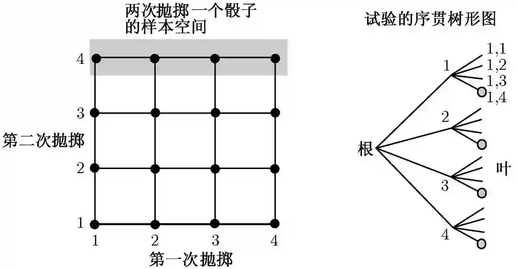 图 1.3 序贯树形图示例.设所考虑的试验连续两次抛掷有4个面的骰子2,其样本空间有两种等价的刻画方法.在这个试验中,可能的结果是全体有序对(i,j ),其中 i 表示第一次抛掷骰子得到的数字,j 表示第二次抛掷骰子得到的数字.试验结果可用左图中的2维格子点表示,也可以用右图中的序贯树形图表示,后者的优点是可以表示试验的序贯特征.在序贯树形图中,每个可能的试验结果可以用一个末端的树叶表示,或等价地用与树叶相联系的由根部到树叶的一个路径表示3.左图中阴影部分代表事件{(1,4),(2,4),(3,4),(4,4)},它表示第2次抛掷得到4.同一个事件可以在右图中用空心圆点标示的叶子集合表示.注意序贯树形图中的每一个结点可以代表一个事件,这个事件就是由这个结点出发的所有的叶子构成的事件.例如,在序贯树形图中用1标示的结点代表事件{(1,1),(1,2),(1,3),(1,4)},即第一次抛掷得1的事件