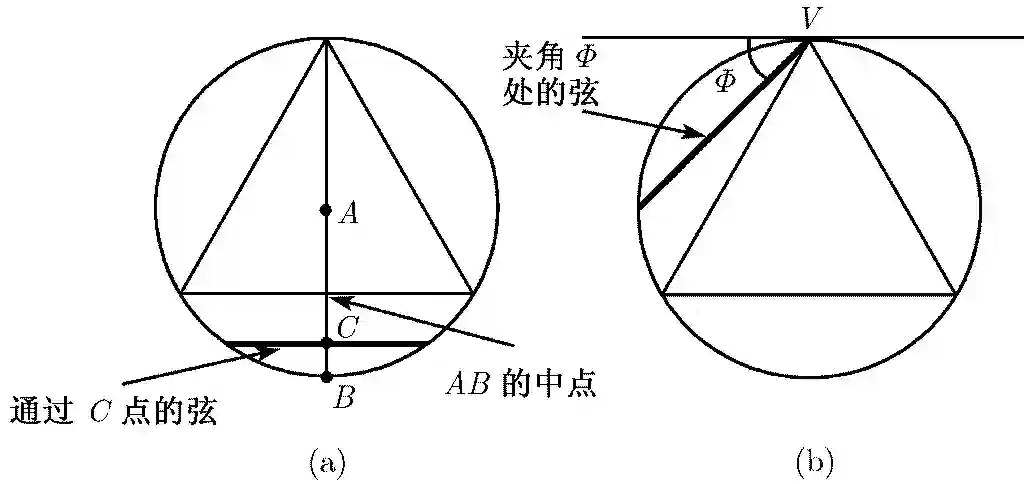 图 1.7 贝特朗悖论.该例子由贝特朗于1889年提供,它说明这样一个原理:解决一个实际问题的时候,必须建立无歧义的概率模型.设在一个圆内有一个正三角形,内接于圆周.现在随机地选定一个弦,问其长度大于内接正三角形的边的概率等于多少?其解答依赖于“随机地选定”的确切定义.图中(a)和(b)的两种方法导致相互矛盾的结论.