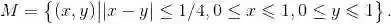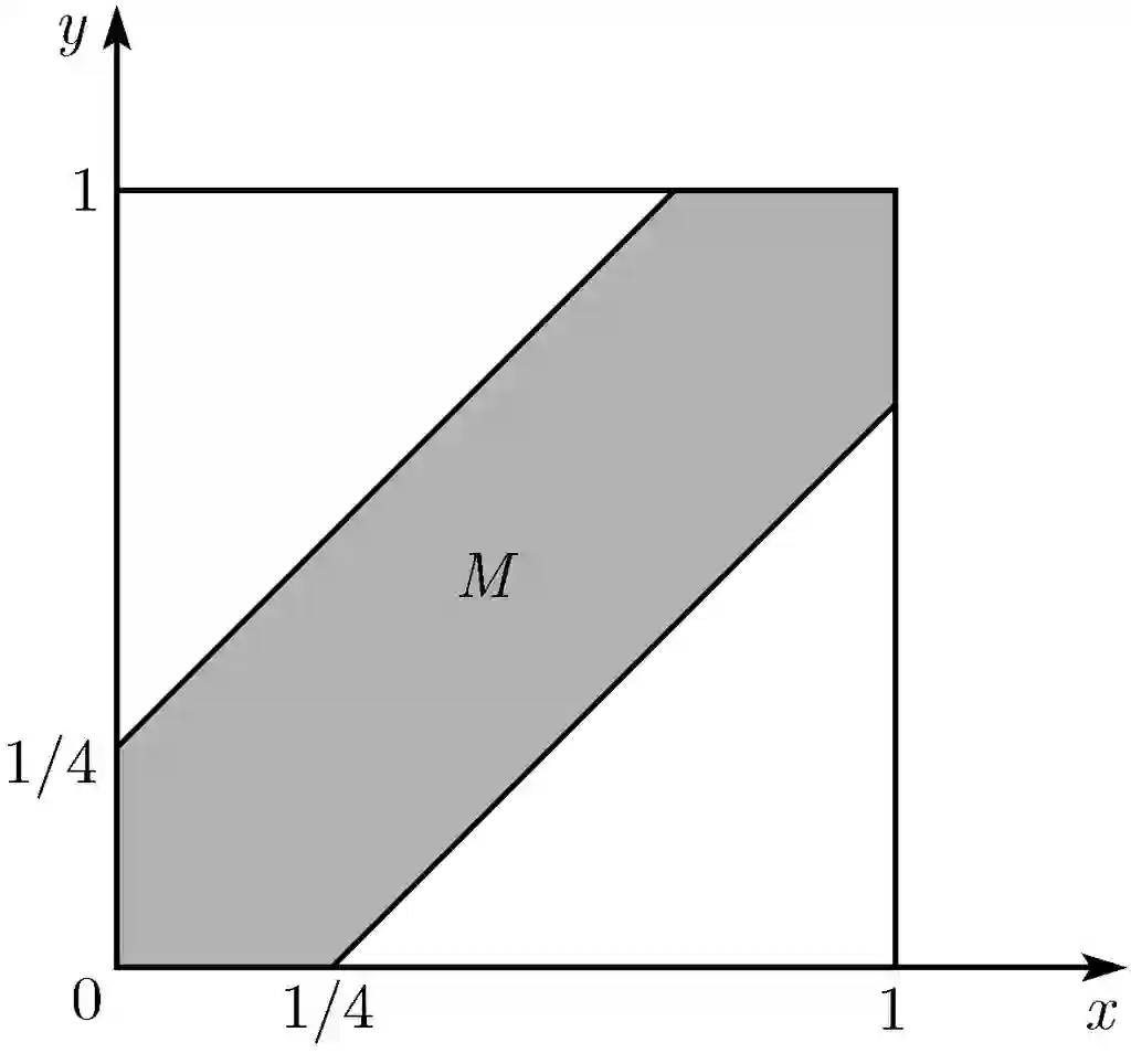 图 1.5 事件 M 代表罗密欧和朱丽叶的相互等待时间不超过15分钟,M 是图中阴影部分(见例 1.5),即