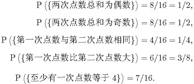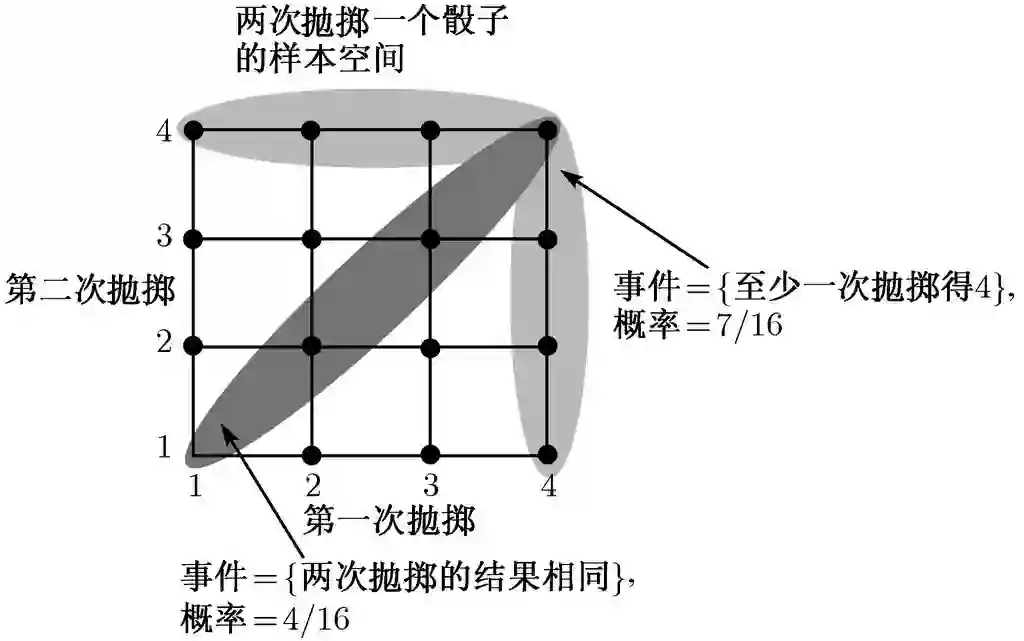 图 1.4 在连续两次抛掷有4个面的骰子的过程中的若干事件和它们的概率,计算依据离散均匀概率律