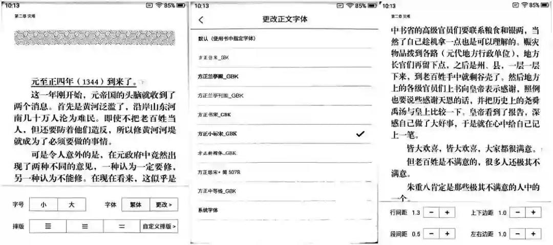 字号只有大、小两个选择,但字体包括了方正仿宋、方正兰亭黑、方正兰亭刊黑、方正书宋、方正小标宋、方正新楷体、方正悠宋、方正中等线以及系统字体、书中指定字体,选择还是挺丰富的。