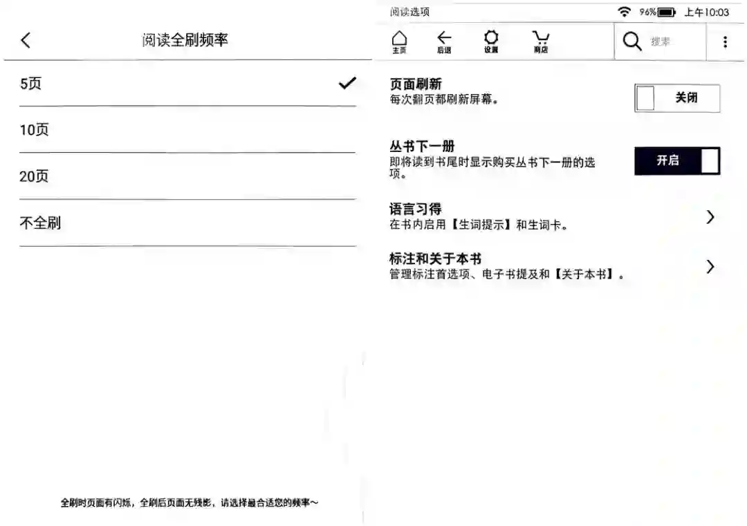 Kindle 其实也提供了类似的选项——页面刷新,但是 Kindle 可以设置为每次翻页都刷新,而且即使不是每次翻页都刷新,我在两款 Kindle 上都没有看到任何残影。