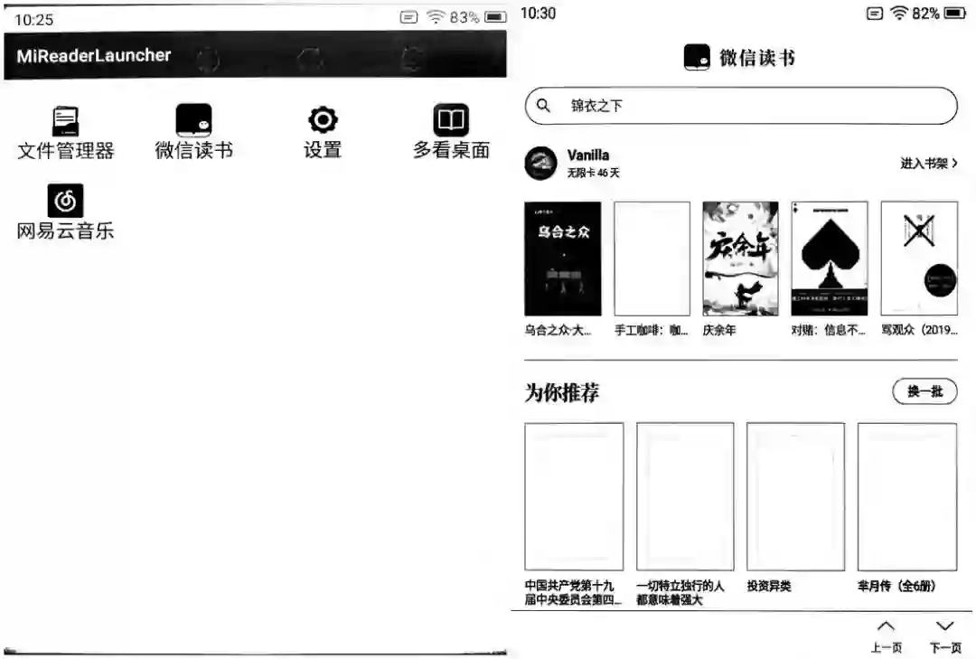 我给这款小米多看电纸书刷了一个第三方的启动器,这样一来我就可以方便地安装第三方应用,比如说微信阅读墨水屏版,使用的流畅度上和原生的多看阅读没有什么区别。虽然启动器使用起来还是有些卡顿,但是考虑到电子墨水屏的刷新率以及绝大多数时间内都在多看桌面或者微信阅读内阅读,刷一个第三方的启动器还是非常值得的。具体的启动器安装教程,可以参考 SMZDM 上的文章(
