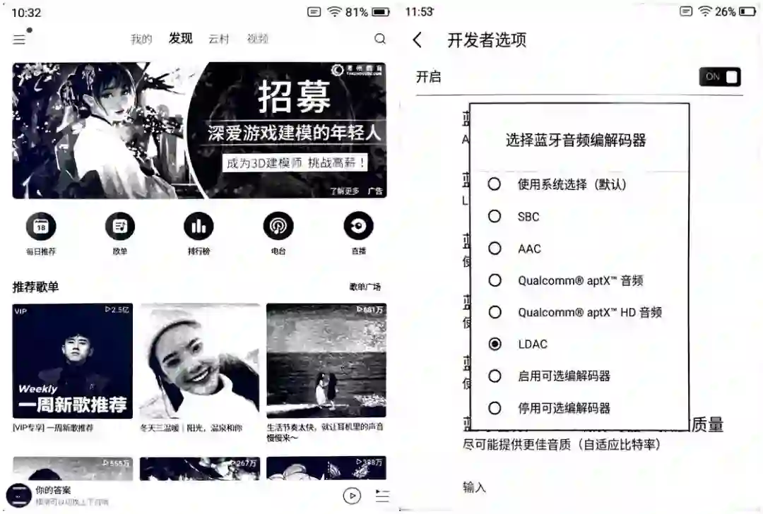 小米多看电纸书其实是有蓝牙功能的,开发者选项里甚至还可以选择 LDAC 协议,于是我试着安装了网易云音乐,也将蓝牙音箱成功配对到了小米多看电纸书上,网易云音乐中的歌曲也可以正常播放,但是我的蓝牙音箱没有发出任何声音。