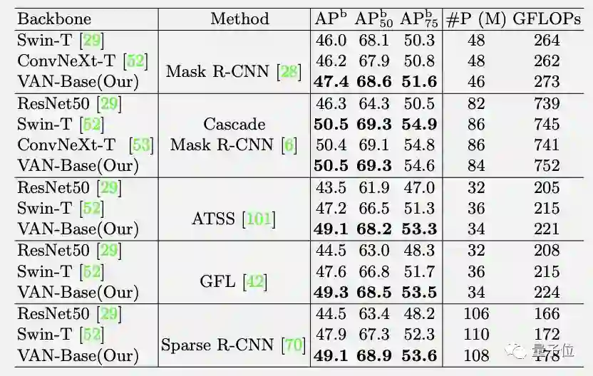 在COCO 2017目标检测任务上,以VAN为Backbone应用多种检测方法也都领先。