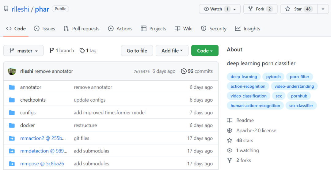 原作者公开了源代码,表示他的目的是看看最先进的人类动作识别(HAR)模型在色情领域的表现如何。
