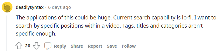 至于这项研究有什么意义,网友表示应用前景可大了!以后在资源网站上检索,可以按照指定的position对视频进行过滤,而不只是传统的标签、标题、类别等等。