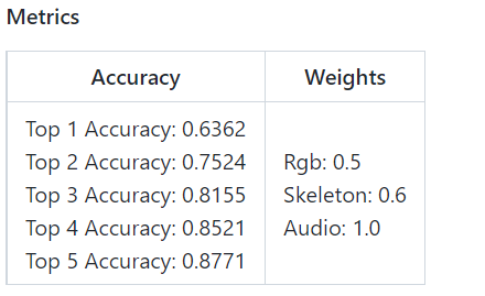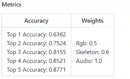 首先介绍一下在性能和运行时间上都表现最好的多模态(Rgb + 骨架 + 音频)模型。