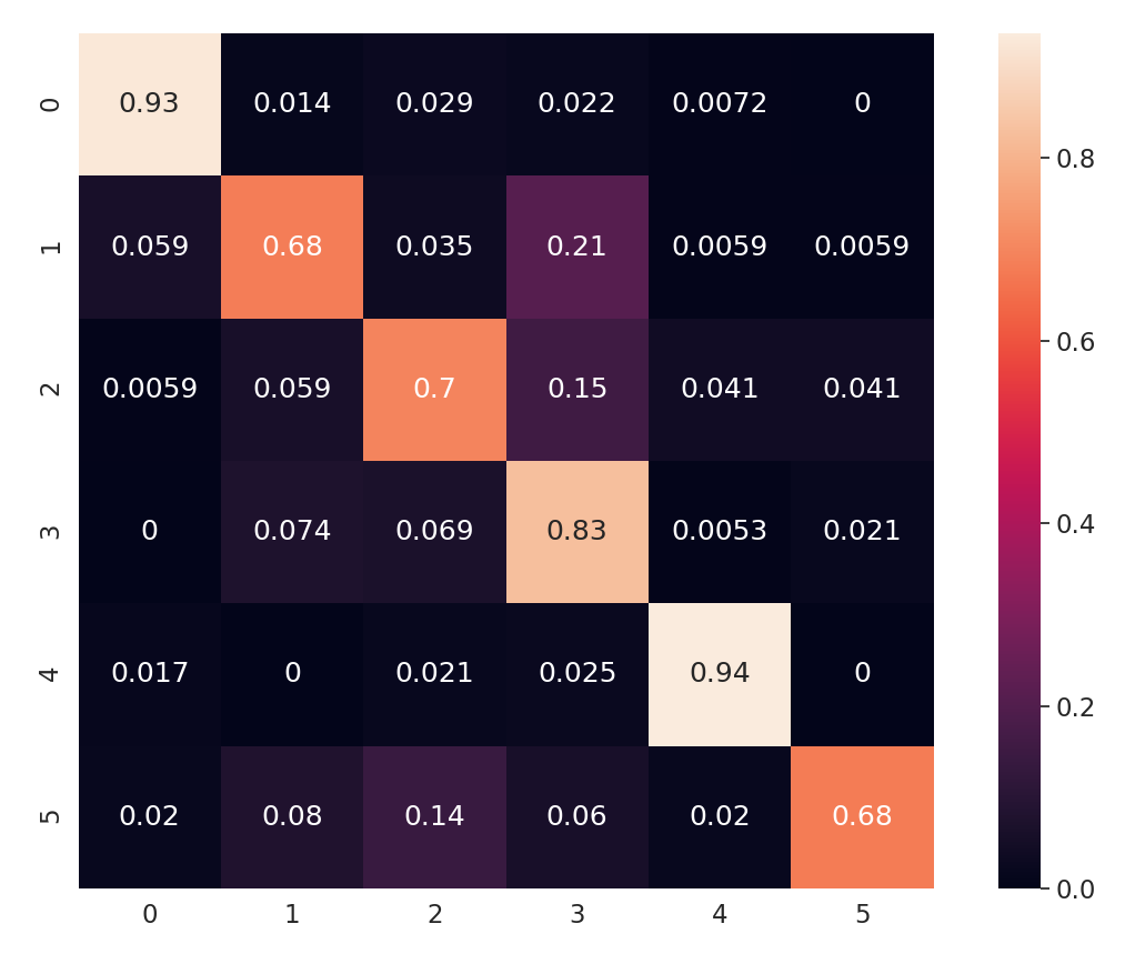 姿势数据集比原始的RGB数据集要小得多,只有33%的帧的置信度高于0.4,所以最终测试集只有815个片段,且目标类别仅为6个。