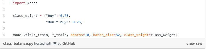 我们创建了一本字典,基本上说我们的「购买」类应该占了损失函数重量的 75%,因为更重要的是「不购买」类,我们相应地设置为 25%。当然,这些值可以很容易地进行调整,以找到应用场景中的最佳设置。如果其中一个类的样本明显多于另一个类,我们也可以使用这种方法进行平衡。我们可以尝试使用权重平衡法来使所有的类都对我们的损失函数产生一样大的影响,而不必花费时间和资源去收集更多的少数类实例。