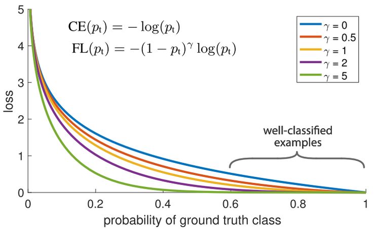 另一个我们可以用来平衡训练实例权重的方法是如下所示的焦距损失法。它的主要思想是:在我们的数据集中,总会有一些比其他示例更容易分类的训练示例。在训练期间,这些例子将被有 99% 的分类准确率,而其它更具挑战性的示例可能表现不佳。问题在于,那些容易分类的训练示例仍会引起损失。当存在其他更具挑战性的数据点时,如果正确分类,那么这些数据点能够对我们的总体准确性做出更大的贡献,为什么我们仍然给予它们相同的权重?