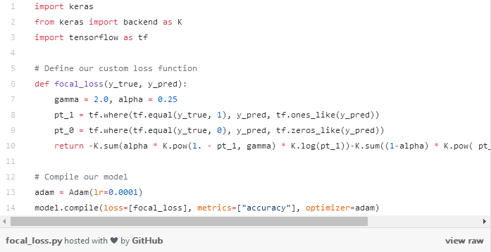 这正是焦距损失法可以解决的问题!焦距损失不是对所有训练实例赋予同等的权重,而是对分类良好的实例进行降权。这样做的直接效果是将更多的训练重点放在那些难以分类的数据上!在存在数据不平衡的实际环境中,大多数类将很快被很好地分类,因为我们有更多的训练样本数据。因此,为了保证我们对少数类的训练也达到较高的准确度,我们可以利用焦距损失在训练中给那些少数类更大的相对权重。焦距损失在 Keras 中可以很容易地实现为自定义损失函数:
