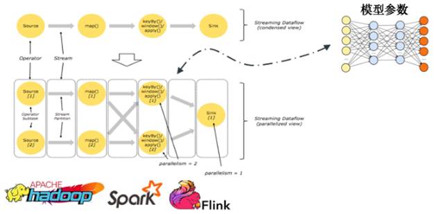 最常见的就是分布式数据流计算模型。数据流模型是一种数据驱动的并行计算执行模型。数据流计算逻辑基于数据流图表达。 用户通过描述一个计算流图来完成计算,对计算流图中的计算节点进行定义,用户一般不需要指定具体执行流程。数据流图内部不同数据的计算一般是异步完成的,其中的计算节点只要上游ready就可以执行计算逻辑。目前主流的ETL(Extract-Transform-Load)数据处理框架比如Hadoop、Spark、Flink等都是基于数据流计算模型。但是机器学习计算任务有一个共享的不断被擦写的中间状态:模型参数,计算过程会不断的读写中间状态。数据流的计算模型在执行过程中一般是异步的,所以很难对共享中间状态——模型参数,进行很好的一致性控制。所以基于数据流计算模型的一致性模型一般都是同步的,在数据流内部保证强一致性,但是基于同步的系统执行性能取决于最慢的计算节点,计算效率比较低。