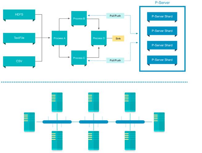其实,数据流计算模型和参数服务器计算模型刻画了机器学习模型训练计算过程的不同方面,机器学习的样本数据的流动用数据流来描述就很自然,模型训练过程中的中间状态可以被参数服务器计算模型自然的描述。因此,这两者进行结合是整体的发展趋势:在数据流中对参数服务器进行读写操作,比如Intel就开发了Spark上的参数服务器。但是数据流计算模型和参数服务器计算模型的一致性模型不尽相同,参数服务器的一致性模型比如BSP或者SSP都会打破数据流原有的异步计算逻辑。参数服务器和数据流结合的灾备策略和一致性管理策略需要仔细的设计才能很好地统一和融合。