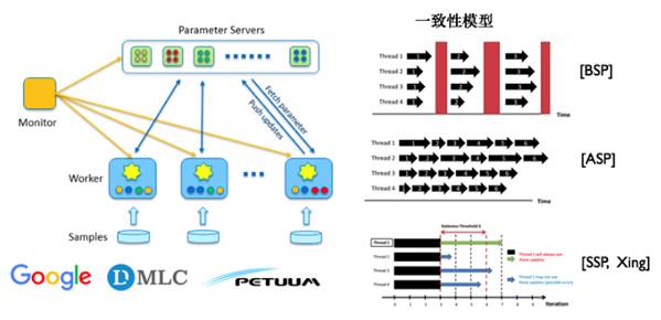 另一个常见的分布式并行计算模型就是基于参数服务器的分布式计算模型。参数服务器就是对机器学习模型训练计算中的共享状态——模型参数管理的一种直观的抽象,对模型参数的读写由统一的参数服务器管理,参数服务器本质上就是一个支持多种一致性模型的高性能Key-Value存储服务。基于参数服务器可以实现不同的一致性模型,一个极端就是BSP(Bulk Synchronous Parallel,同步并行),所有的计算节点在计算过程中都获取一致的模型参数,对于算法实现而言有一致性的保障,但是代价是同步造成的资源浪费;另一个极端是ASP(Asynchronous Parallel,异步并行),所有的计算节点在计算过程中彼此之间的模型参数没有任何的一致性保证,计算节点之间完全异步执行,这种一致性模型计算效率很高,但是模型参数没有一致性保证,不同节点获取到的是不同版本的模型,训练过程不稳定,影响算法效果;CMU的Erix Xing教授提出了介于BSP和ASP两者之间的SSP(Stale Synchronous Parallel),通过限制最大不一致的参数版本数来控制整体的同步节奏,这样既能缓解由于同步带来的执行效率问题,又使得算法相对于ASP在收敛性质上有更好的保证。基于不同的一致性模型可以很好地在运行速度和算法效果上进行权衡。