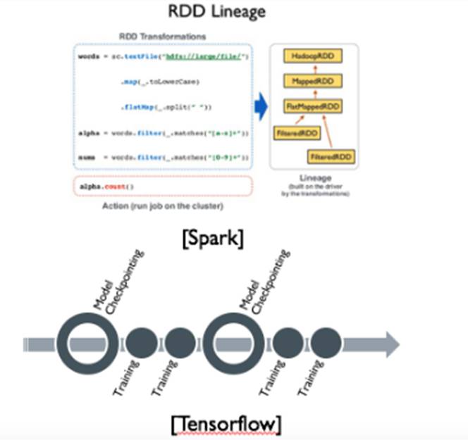 在业界常见的有Data Lineage和Checkpointing两种机器学习训练任务灾备方案。Data Lineage通过记录数据的来源,简化了对数据来源的追踪,一旦数据发生错误或者丢失,可以根据Data Lineage找到之前的数据利用重复计算进行数据恢复,常见的开源项目Spark就使用这种灾备方案。Data Lineage的粒度可大可小,同时需要一个比较可靠的维护Data Lineage的服务,总体overhead较大,对于机器学习模型训练中的共享状态——模型参数不一定是很好的灾备方式,因为模型参数是共享的有着非常多的中间状态,每个中间状态都依赖于之前版本的模型参数和中间所有数据的计算;与Data Lineage不同,机器学习模型训练系统中的Checkpointing策略,一般会重点关注对机器学习模型参数的灾备,由于机器学习是迭代式的,可以利用这一点,在满足机器学习一致性模型的情况下,在单次或多次迭代之间或者迭代内对机器学习模型参数以及训练进度进行灾备,这样在发生故障的情况下,可以从上一次迭代的模型checkpoint开始,进行下一轮迭代。相比于Data Lineage,机器学习模型训练系统对模型参数和模型训练进度进行Checkpointing灾备是更加自然和合适的,所以目前主流的专门针对机器学习设计的计算框架比如Tensorflow、Mxnet等都是采用Checkpointing灾备策略。