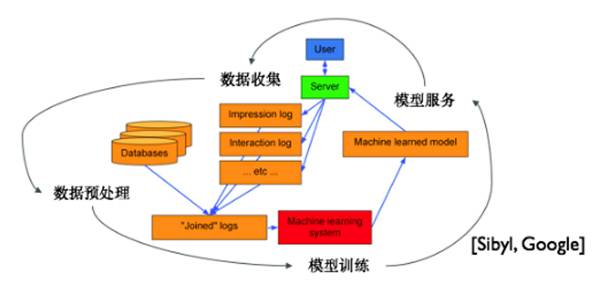 机器学习的经典定义,是利用经验(数据)来改善系统性能。在应用过程中,首先要明确机器学习目标的定义,也就是用机器学习来做什么事情。以谷歌提升搜索广告业务收入为例,谷歌首先对提升收入的目标进行拆解,广告收入=平均单次点击价格点击率广告展现量,其中“广告展现量”被硬性控制(考虑到政策法规和用户体验),“单次点击价格”受广告主主动出价影响,与上面两者不同,“点击率”的目标明确,搜索引擎记录了大量的展现点击日志,而广告候选集很大,不同广告的点击率差别很大,谷歌广告平台有控制广告展现的自主权,因此对于谷歌提升搜索广告收入的问题而言,机器学习最适合用来优化“广告点击率”。在确定了机器学习具体的优化目标是广告点击率之后,谷歌机器学习系统会循环执行四个系统:数据收集→数据预处理→模型训练→模型服务(模型服务产生的数据会被下一个循环的数据收集系统收集)。在这四个系统中,与机器学习算法最相关的就是模型训练系统。