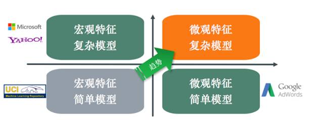 机器学习技术也在工业应用中不断发展,最早期的机器学习工业应用只利用宏观特征、简单模型,到后来发展为两个不同的流派:以微软、雅虎为代表的只利用宏观特征但使用复杂模型流派,以谷歌为代表的使用简单模型但利用微观特征流派,到现在,利用更多微观特征以及复杂模型去更精细地刻画复杂关系已是大势所趋。这便对模型训练提出了更高的要求。